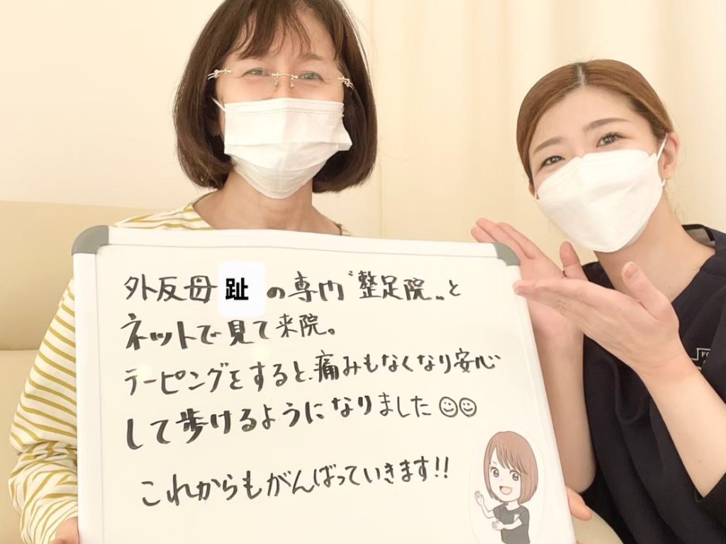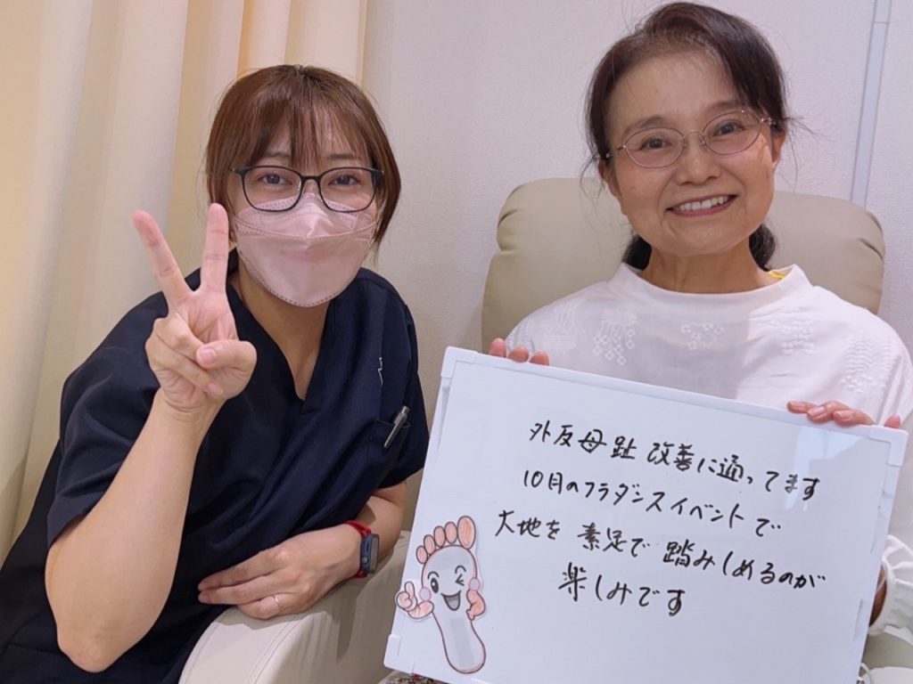 年齢とともに徐々に外反母趾が悪化し、見るからに出っぱってきていましたし、太いヒールでも痛みで辛くなってきたので、まずは足を専門としている整形外科クリニックを受けました。レントゲンを撮って骨の状態をみて、インソールの提案を受けましたが、もし手術してもインソールはずっと使い続けると聞き、期待していた方向性と違っていたので困っていた矢先に整足院さんと出会いました。