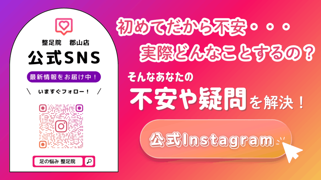 JR各線 郡山駅からバス15分 総合福祉センター徒歩3分!これまで多くの足のトラブルに向き合ってきたスタッフが在籍し、外反母趾・内反小趾・浮き指など幅広い足のお悩みに対応いたします。特許取得の独自テーピング技術で、痛みの原因からしっかり改善!